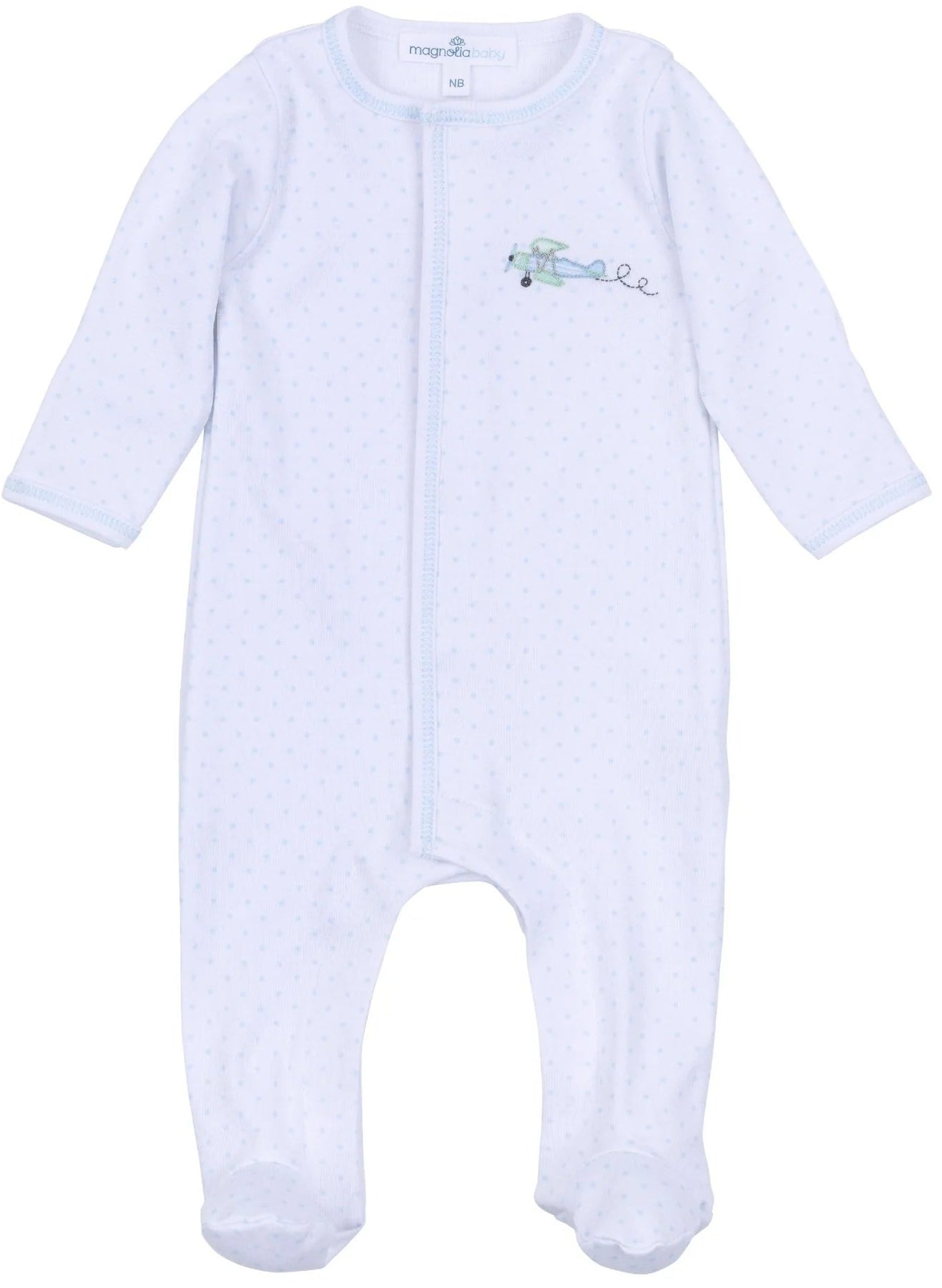 This classic footie is perfect for all-day cozy wear. Made from our luxurious Pima Cotton, this piece features delicate airplane embroidery on a subtle minidots fabric, with a beautiful picot trim along the edges.