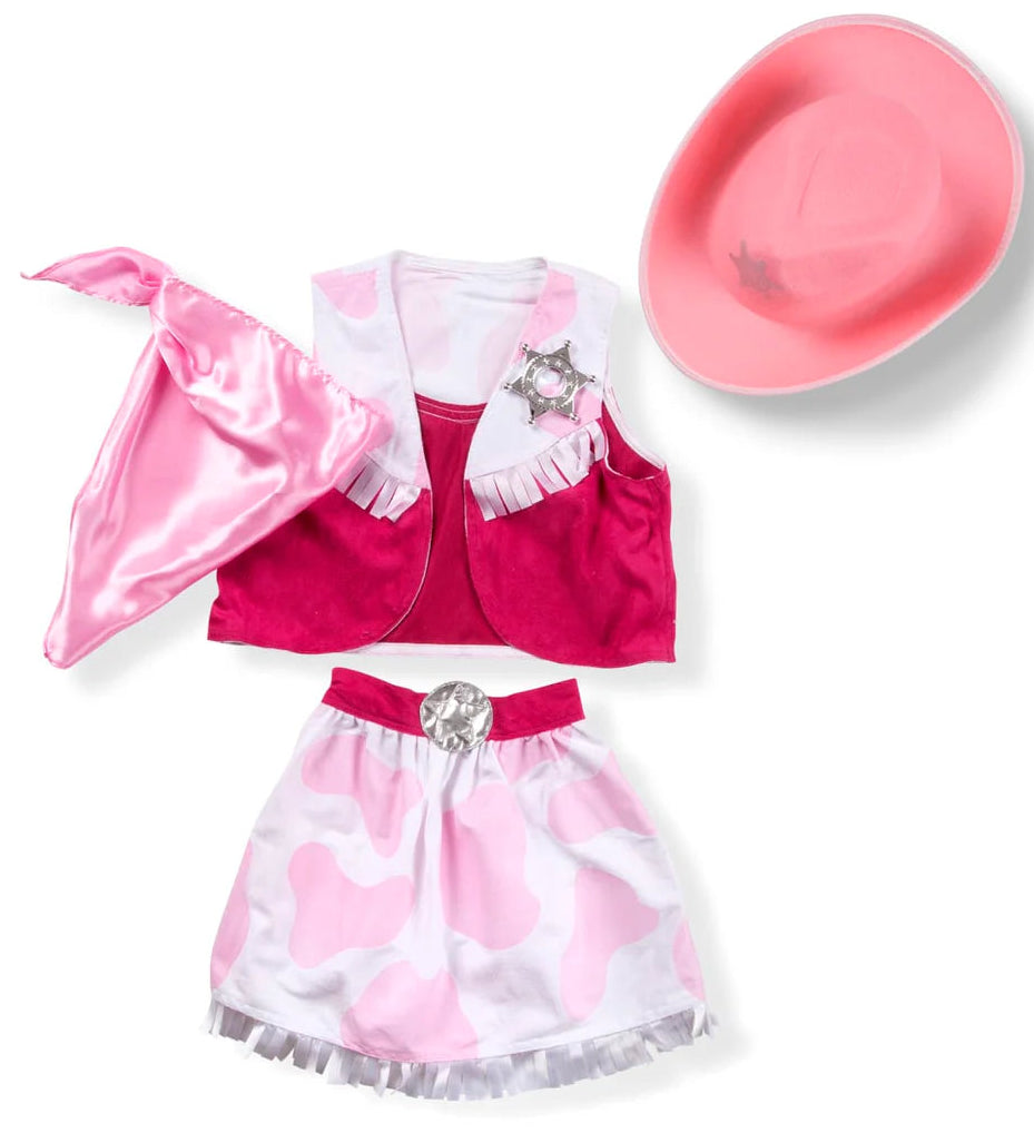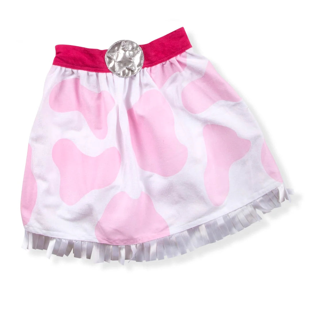 Ready for some cowgirl dress-up? Yeehaw! This set has everything a little cowgirl needs for some wild-west adventures. The role play costume includes a pink and white cow-print skirt with a shiny buckle, a cow-print vest with fringe, a pink satin neck scarf, a cowgirl hat, and a removable sheriff's badge. The Cowgirl Role Play Set is sized to fit preschoolers ages three to six. The high-quality fabrics and solid construction ensure durability so little ones can wear it over and over again. The outfit can be machine washed, and it comes with accessories that can easily be wiped clean. With authentic cowgirl details, these role-play accessories encourage lots of exciting pretend play for that new sheriff in town! The costume set helps promote narrative thinking and creative expression, along with independent and cooperative play. It makes a great gift for kids ages three to six for hands-on, screen-free play.