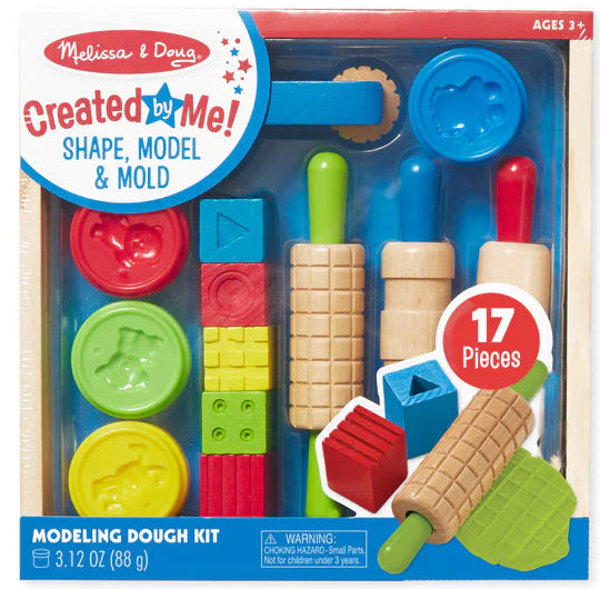 Kids can let their imaginations soar with the Shape, Model, and Mold Clay Activity Set. It features vibrant colors of modeling dough and easy-to-use tools just waiting for hands-on creativity. The set includes four tubs (3.12 oz.) of brightly colored modeling dough (red, yellow, blue, and green) each with an adorable animal-shaped molding lid. The kit also includes a patterned wheel press, five easy-grip, wooden stamping cubes, and three wooden rolling pins with unique patterns. The activity set for kids is sized just right for little hands. It's a great toy for practicing fine motor skills, finger strength, color recognition, shape recognition, and creative expression. Kids can have loads of fun as they shape, squish, stamp, roll, and press the modeling clay and then create stories and adventures to go along with their creations. It makes a great gift for boys and girls ages three and up for hands-on, screen-free play.