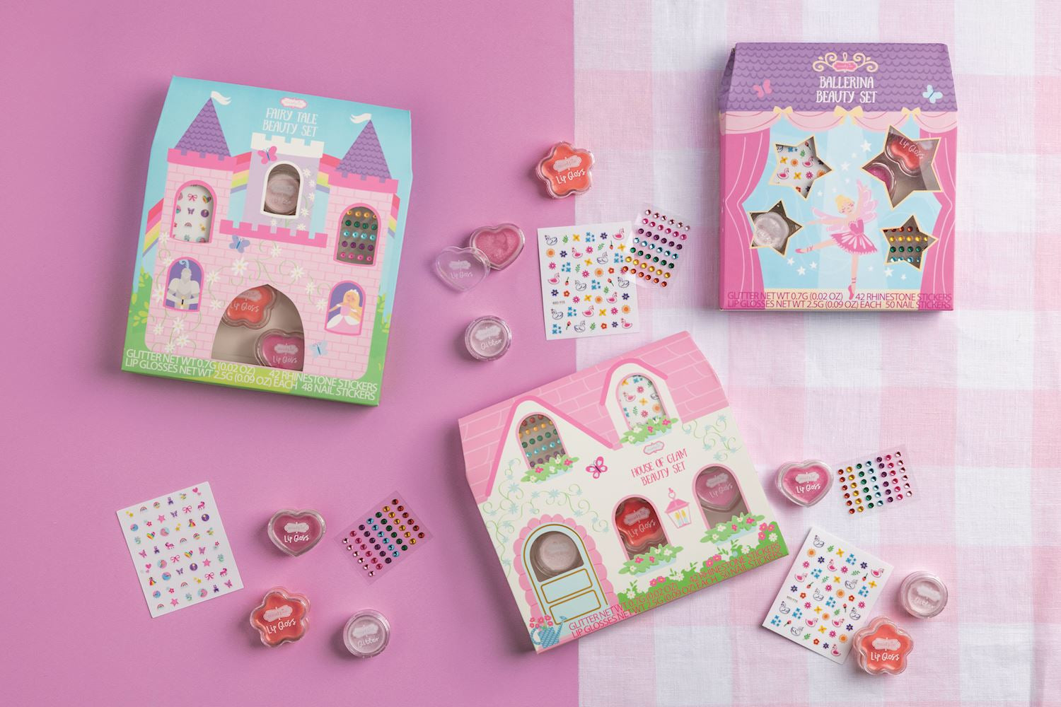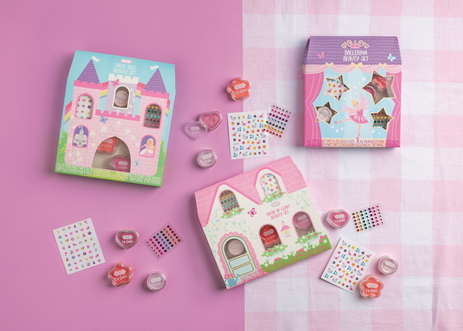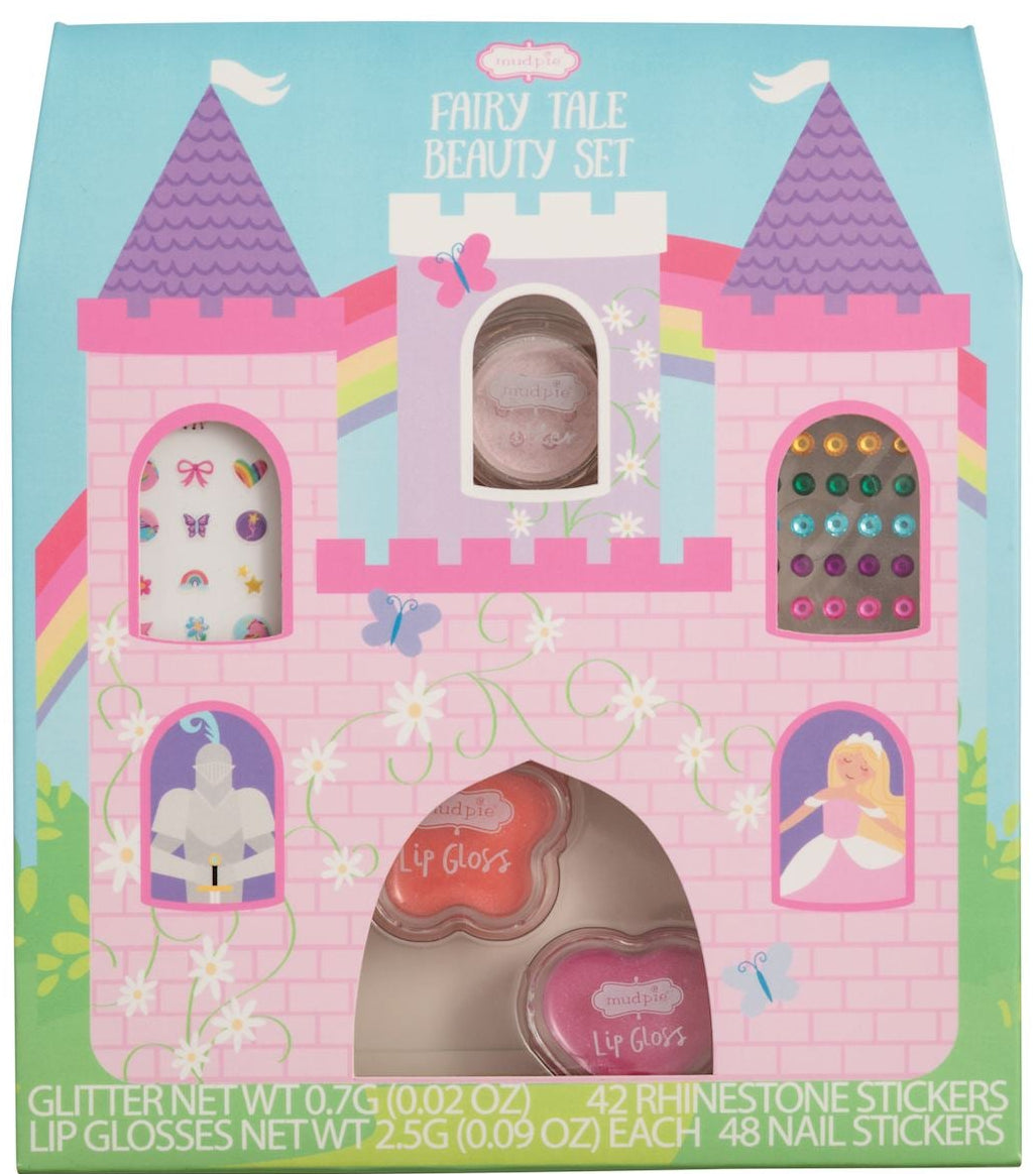 5-piece set includes two pots of glitter lip gloss, one pot of shimmer glitter, sheet of nail stickers and sheet of stick-on nail or face jewels. Ages 3+