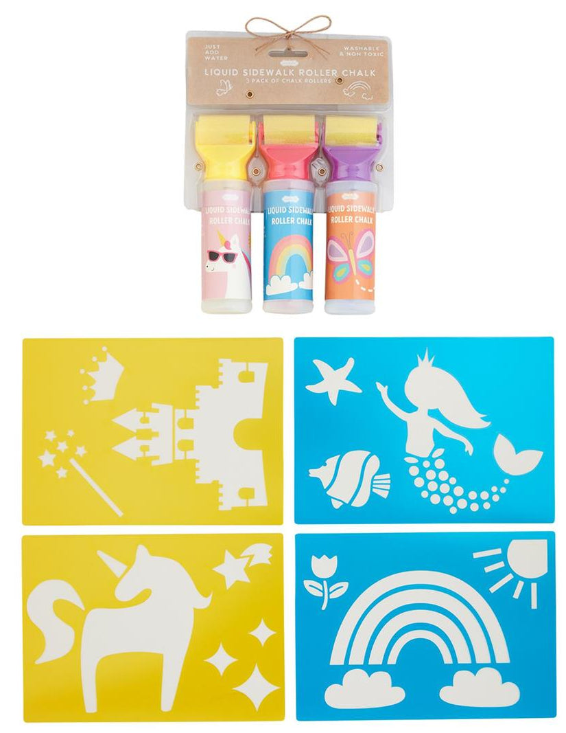 7-piece set. Three bottles of liquid roller chalk paint. Comes with four stencils. Ages 3+.