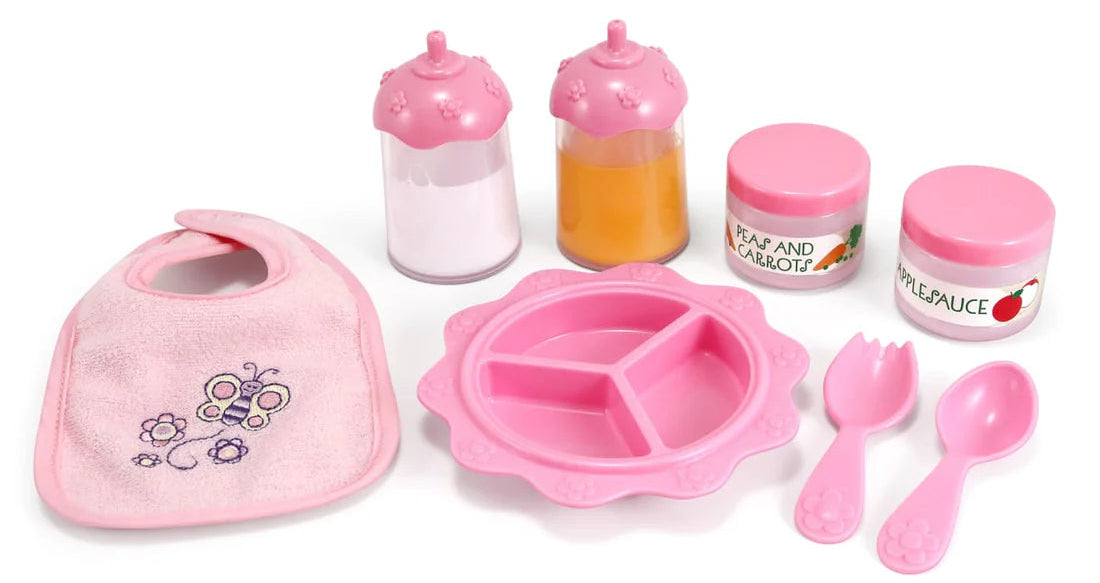 Little caregivers can take care of their baby dolls with this adorable 8-piece set. An easy-close, embroidered bib, keeps baby clean during mealtime which is organized with a divided dish, fork, spoon and yummy "applesauce" and "peas and carrots" for the baby. Disappearing "orange juice" and "milk" bottles add nutrition and fun!