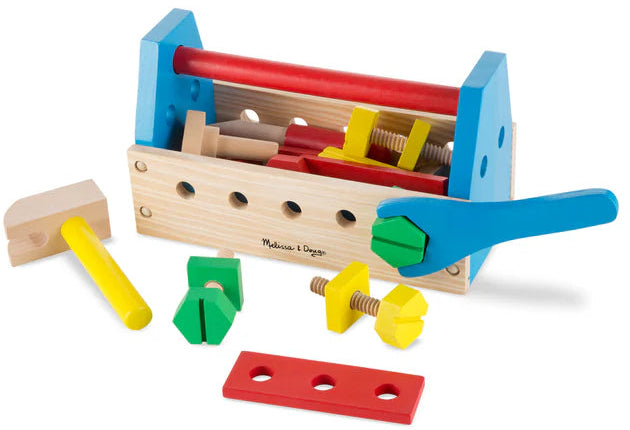 This Melissa & Doug toolkit is a great way to help build imaginations! You can give little builders the tools they need for truly constructive play with this sturdy wooden Take-Along Tool Kit. The set is made from high-quality wood painted in bright, bold colors, and includes 24 pieces sized just right for little hands. The play toolbox comes with wooden nails, screws, nuts, and bolts, plus a toy hammer, wrench, and screwdriver. While playing with this Classic Toy kids can have hours of creative fun while practicing hand-eye coordination, count, sorting, color recognition, and problem-solving skills. The sturdy wooden handle provides an easy way for preschoolers to carry the kit and "fix" things around the house. Then when the job is done, they can pack up all their tools so they're ready for next time. It makes a great gift for preschoolers and kids ages three and up for hands-on, screen-free play.