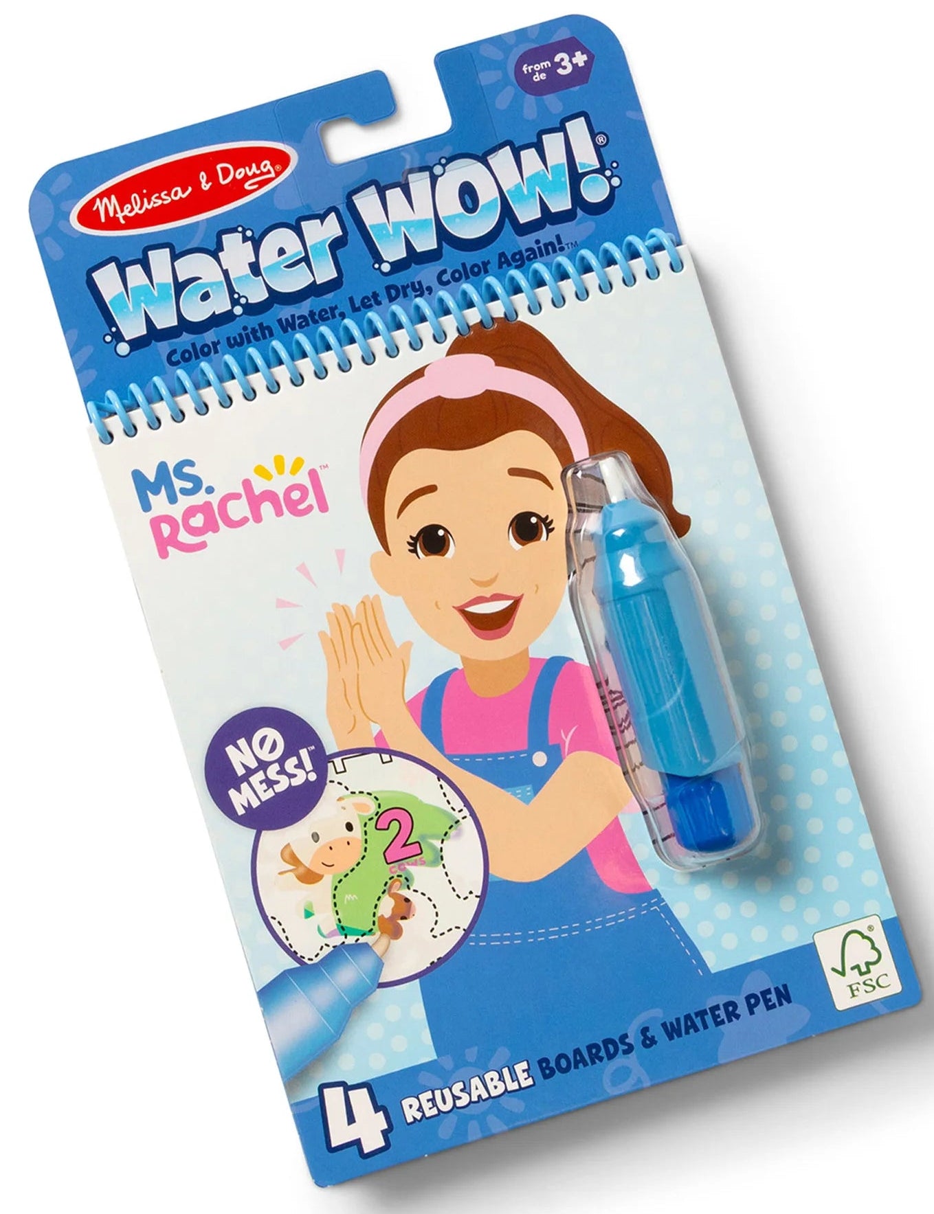 This exciting and reusable spiral-bound activity pad features scenes and activities with popular educator Ms. Rachel and friends on four reusable Water WOW! boards! Pages in the spiral-bound book are white when dry, and reveal colors, pictures, shapes, and numbers when wet. Let the pages dry to erase, then color with water again and again! Each scene is based on one of Ms. Rachel’s well-loved songs and activities (Where’s Mama, What’s in the Box, Icky Sticky Bubble Gum, Day at the Beach). The chunky-sized water pen is easy to fill, easy for small hands to grasp, and stores in the activity pad – making it a terrific travel toy. These Melissa & Doug toys are toddler learning toys, designed by Ms. Rachel and developmental experts, to support all children through their ages and stages, from 2-5+ years. Ms. Rachel toys are ideal newborn toys, toddler toys, preschool toys, and wooden toys. From baby shower gifts to baby essentials, these products help babies and families learn, bond, and thrive. Ms. Rachel is a real teacher and passionate educator, with two master’s degrees in education, who creates research-based videos and products to support learning for littles.