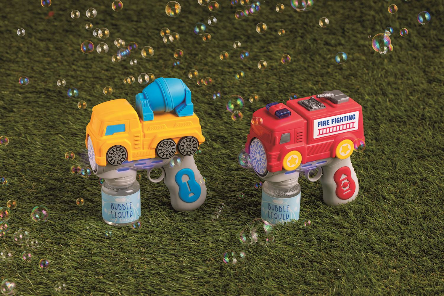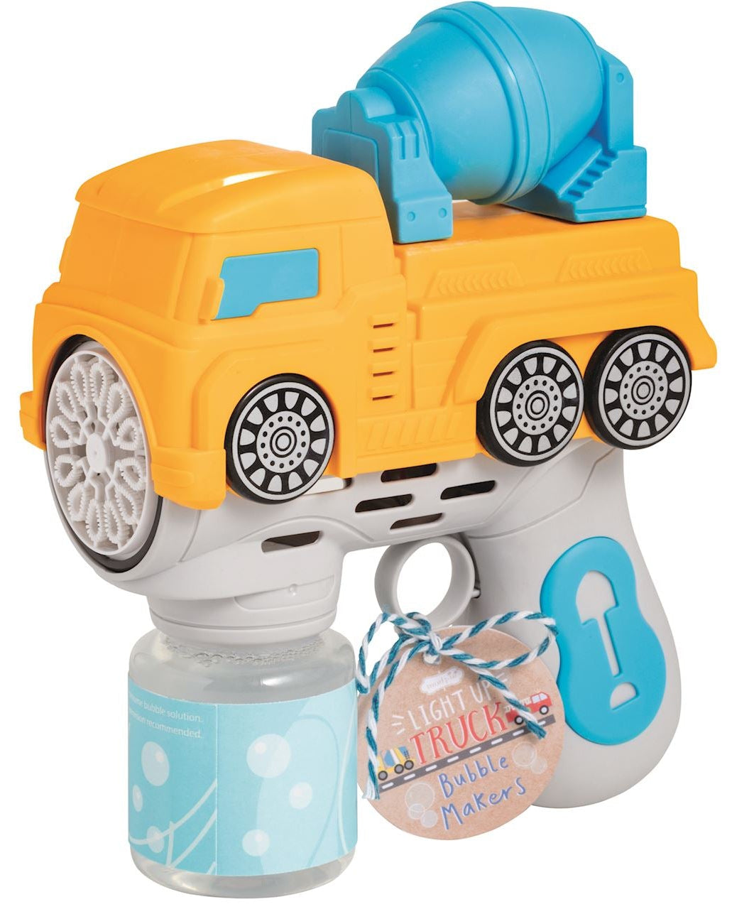 Vehicle lights up and creates continuous stream of bubbles as trigger is pulled. Bubble solution included.