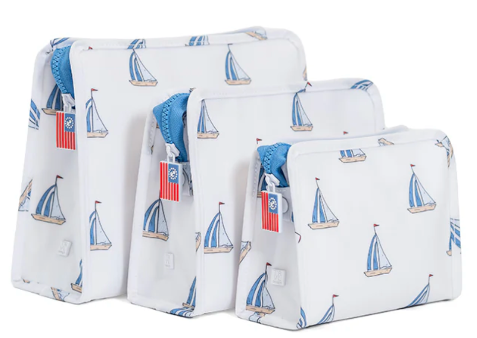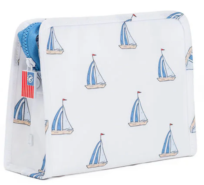 Our best-selling Roadies are our BFFs in the pouch world! Available in 3 sizes, our Medium Roadie is made in a cotton gingham with a thin Eco-friendly matte coating, an inside slip pocket and exterior snap open zip tabs for a wider opening and an easier access.
