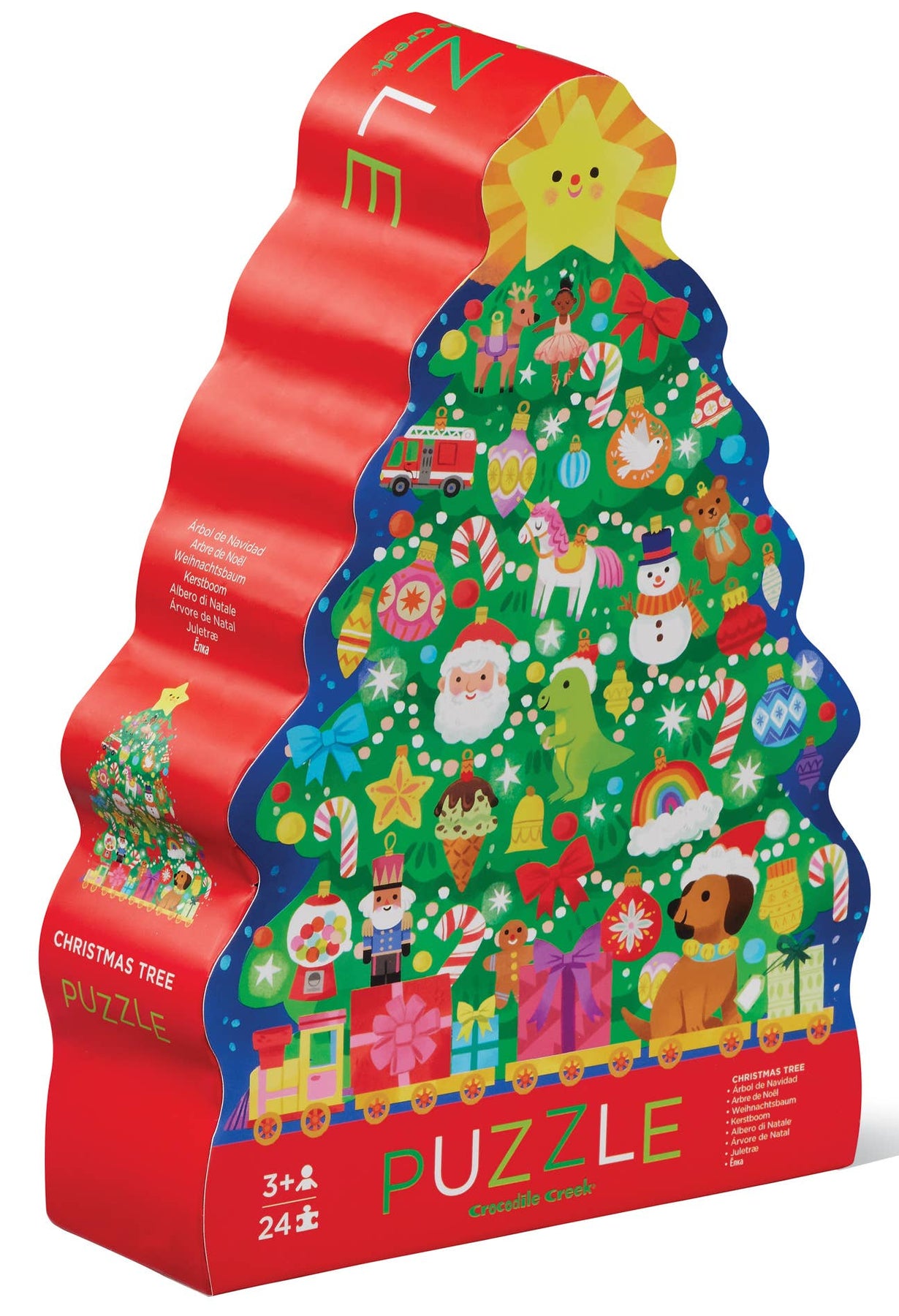 Crocodile Creek's 24-piece Christmas Tree puzzle will delight all ages with its whimsical and colorful depiction of a festive Christmas tree adorned with ornaments, presents, and cheerful characters. Made with sturdy, oversized pieces, it's perfect for little hands. All of Crocodile Creek's puzzles are printed with soy-based ink on recycled cardboard. The uniquely shaped storage box is sturdy and will keep all the pieces together when the puzzle is not in use.
