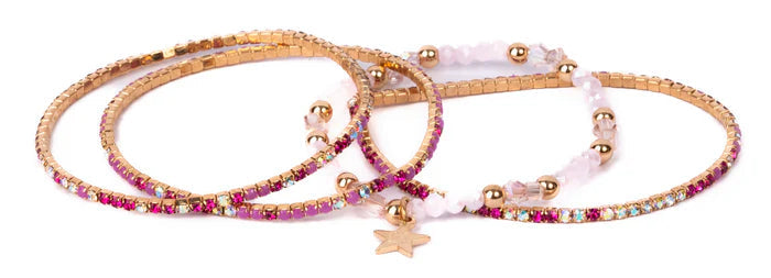The Boutique Glam Girl Bracelet Set is the ultimate accessory for young trendsetters! This fabulous set includes three sparkling rhinestone bracelets that shine with every move, adding a touch of glam to any outfit. Paired with a stunning beaded bracelet featuring a beautiful combination of gold, white, and pink beads, this set is perfect for stacking or wearing individually.