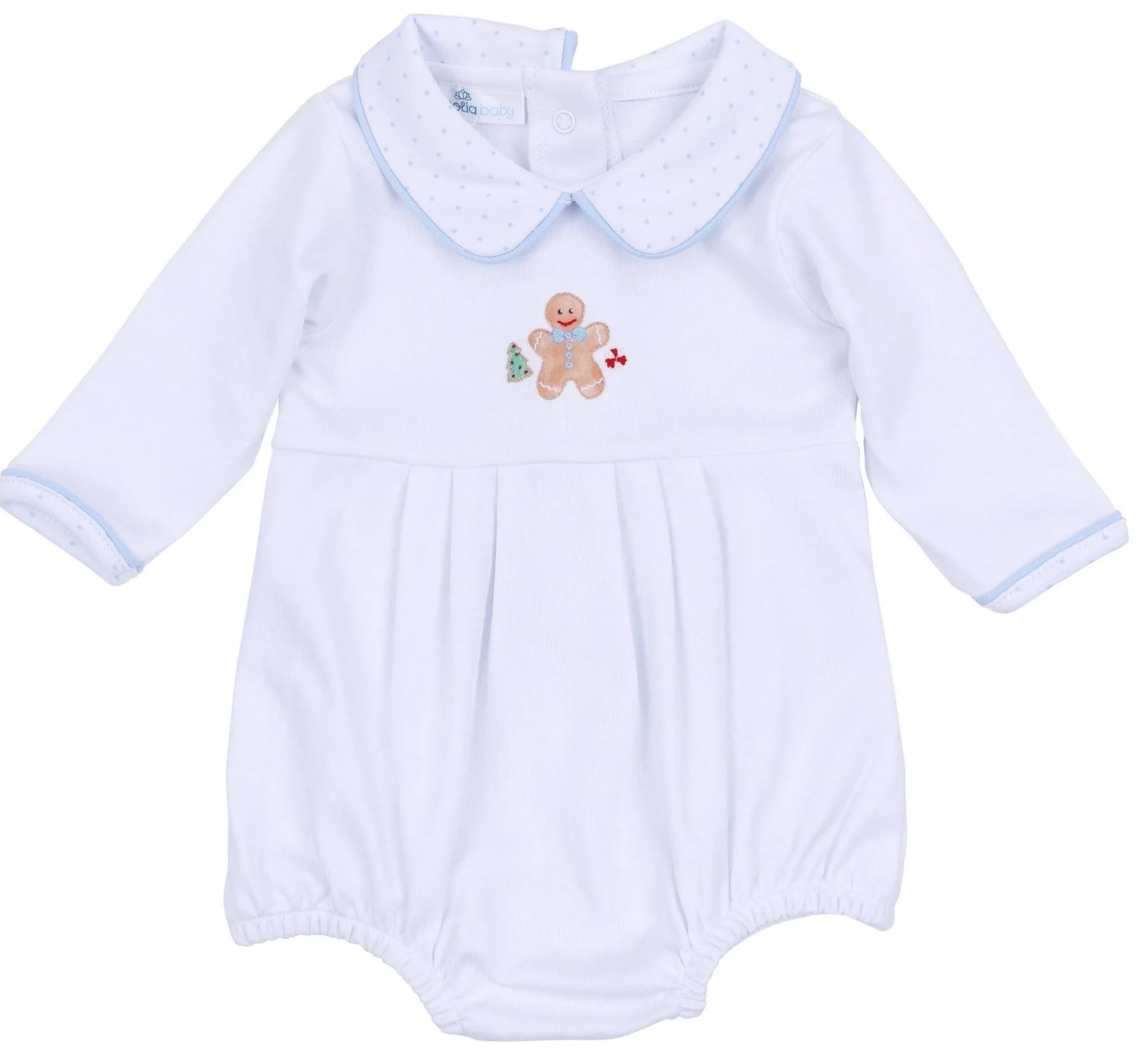 Celebrate the Christmas season in this delightful long sleeve bubble, crafted from luxurious Pima Cotton. It features a gingerbread girl and is accented with a delicate pink embroidered collar and ruffles, providing a charming and cozy outfit for cooler days.