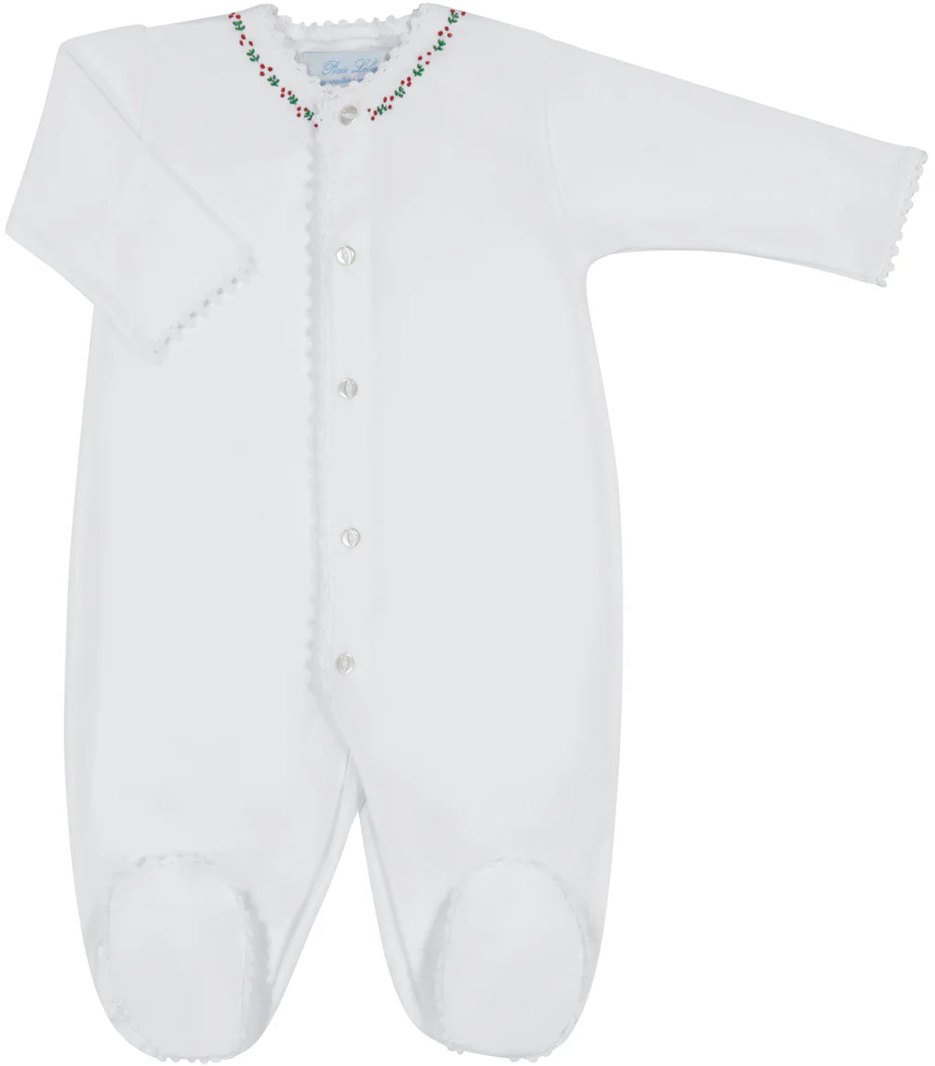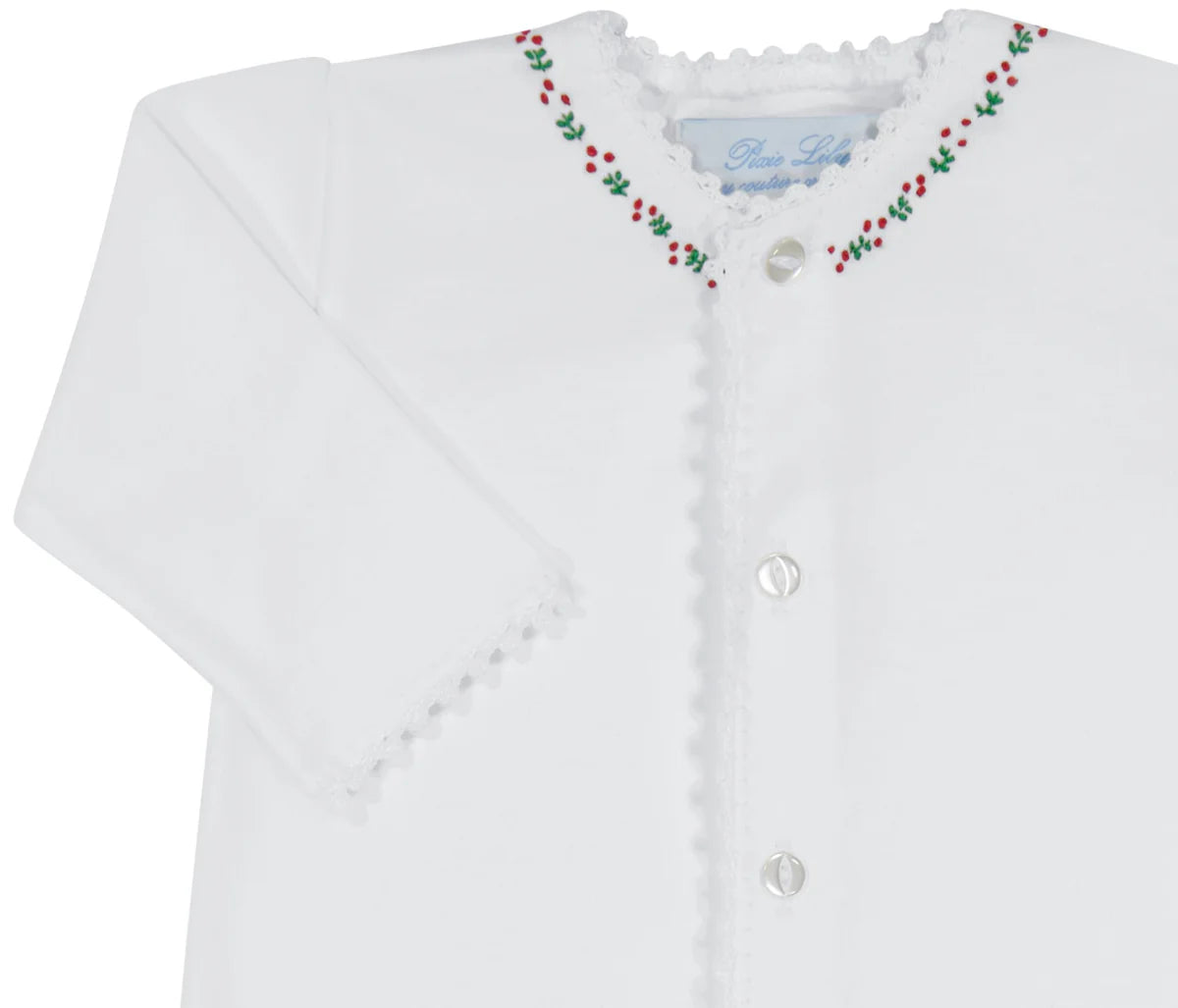 Our delicate holly embroidery and crochet trim embellish a cozy romper.