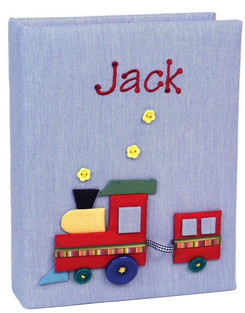 This handmade multicolored train is carefully placed on micro striped cotton and it's guaranteed to never run out of steam. Available in blue microstriped cotton. The fabric-wrapped album measures 7″ x 9″ , is PVC and acid-free and holds 208 4″ x 6″ prints.
