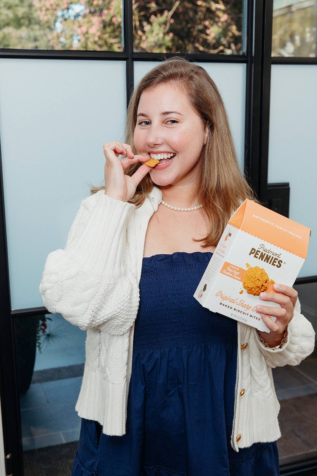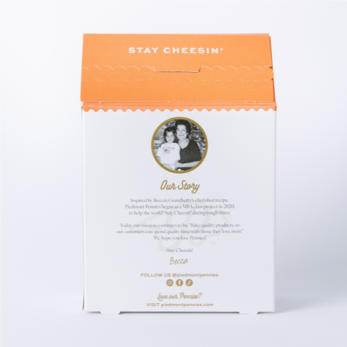 "Pennies" are crunchy, cheesier cheese straws in coin shape, made from a family recipe passed down from Grandma Betty. These handcrafted, small-batch cheese crackers feature sharp cheddar cheese and a crunch in every bite. Using 7 simple, high-quality ingredients, including non-GMO locally sourced flour, these crackers are the perfect addition to any charcuterie board or wine night. Proudly made in North Carolina by a woman-owned, family business, Piedmont Pennies crackers are sugar-free and offer a nostalgic, gourmet snack that’s ideal for gifting or entertaining. Why You’ll Love Them: - Handcrafted & Small Batch - Made with 7 Simple Ingredients - Non-GMO & Sugar-Free - Perfect for Gifting & Entertaining - Woman-Owned, Local Business - Shelf life: 1 year (unopened). Each 15 oz recyclable, paper carton is resealable, with a resealable zip pouch inside of almost one pound of crackers! Great for a weekend getaway, hostess gift, party, or pantry staple.