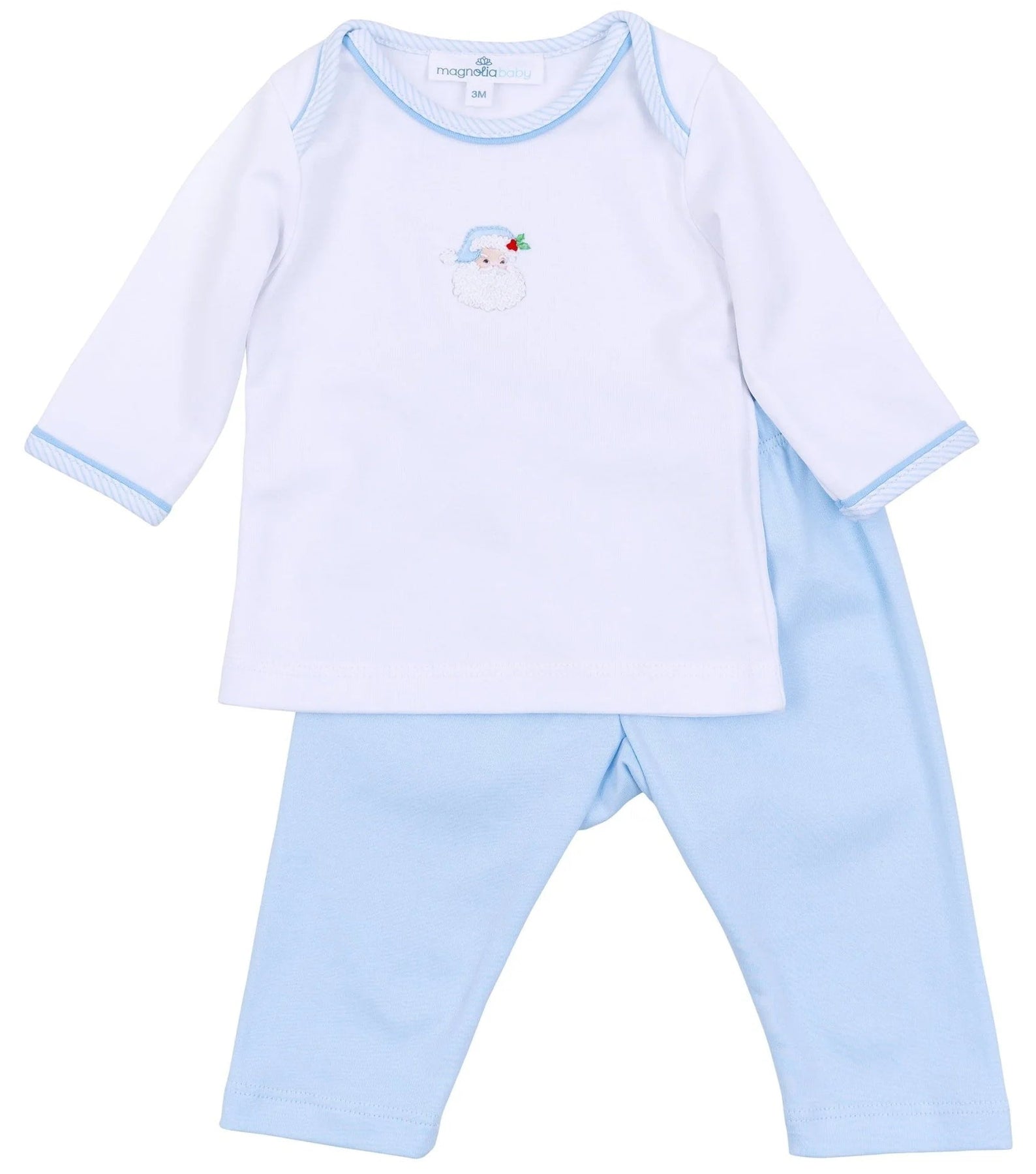 Dress him in festive comfort with our Santa Baby Embroidered 2pc Pant Set - Light Blue. Inspired by the joyful spirit of Santa Claus, this charming white pajama set, crafted from luxurious Pima Cotton, features a sweet hand-embroidered Santa.