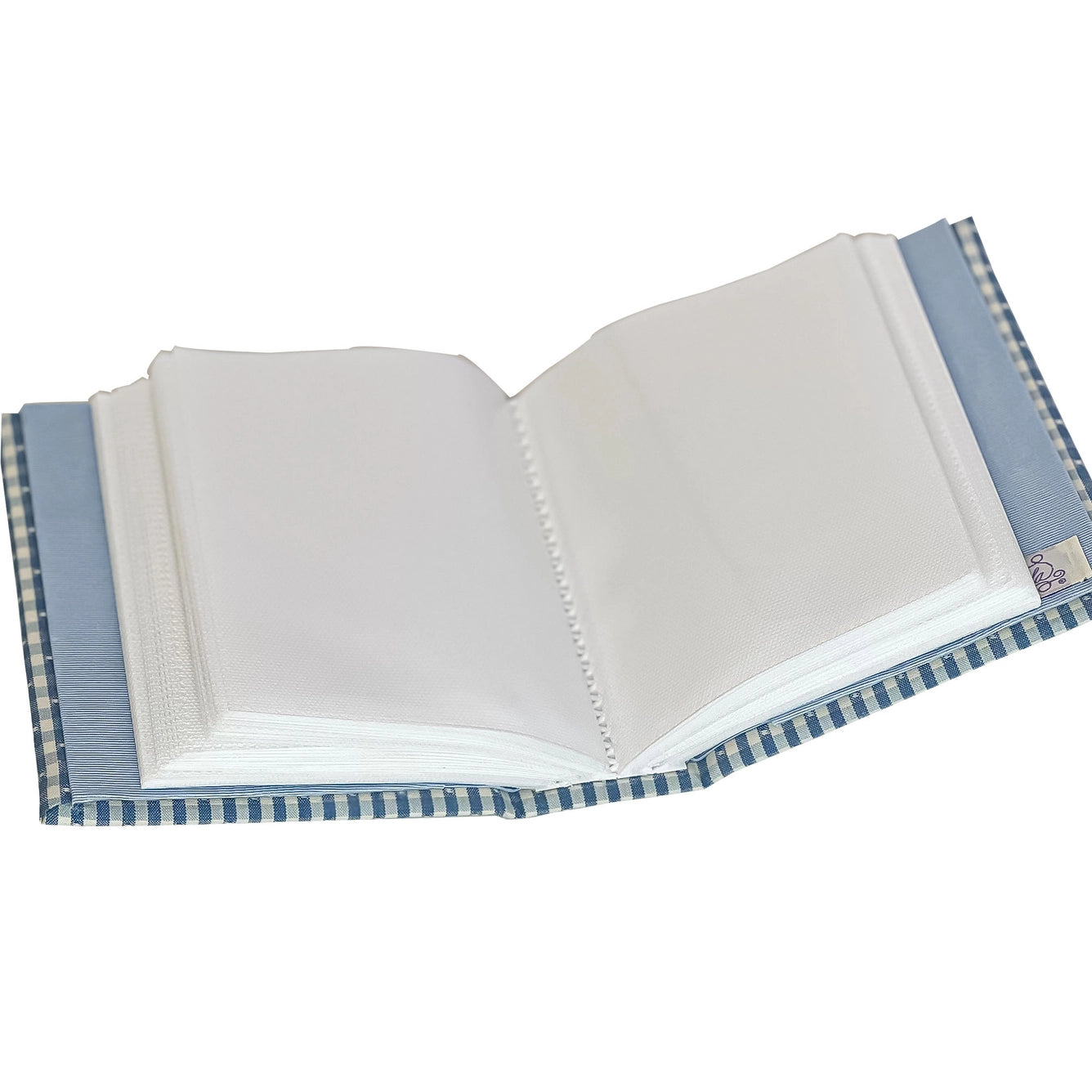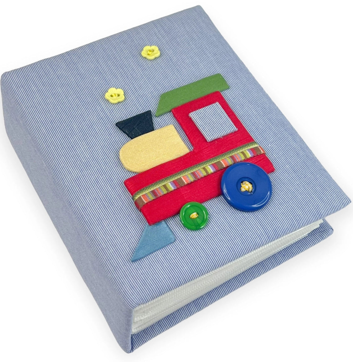 This handmade multicolored train is carefully placed on micro striped cotton and it's guaranteed to never run out of steam. Available in blue microstriped cotton. The fabric wrapped photo album measures 5″ x 6.5″ and contains 50 PVC-free, acid-free pocket pages with space to hold 100 photos up to 4″ x 6″.