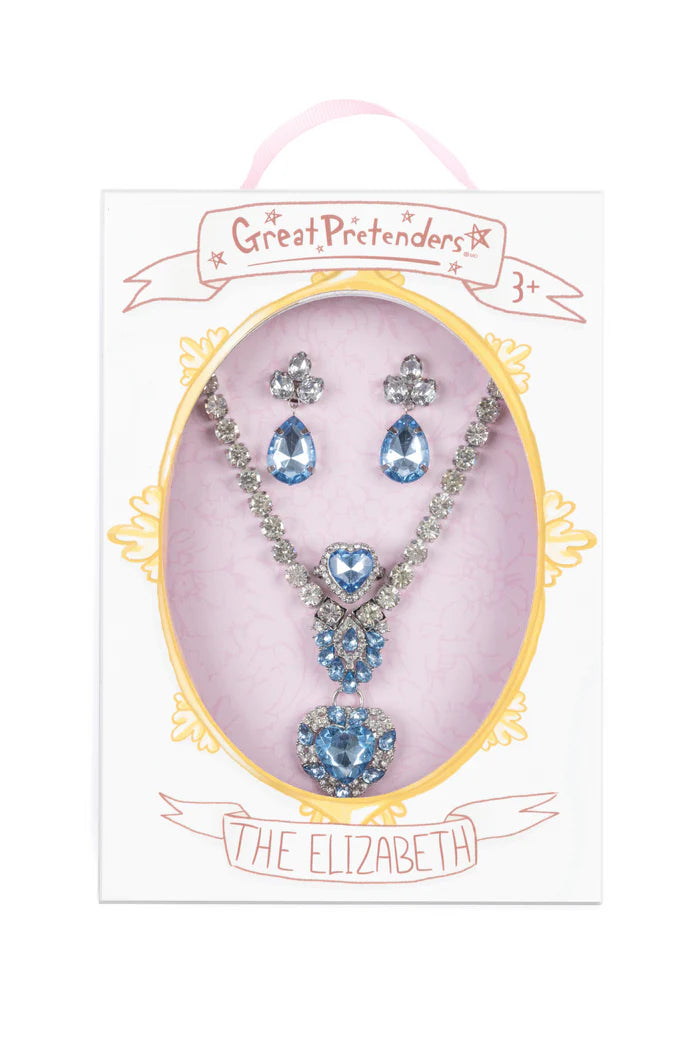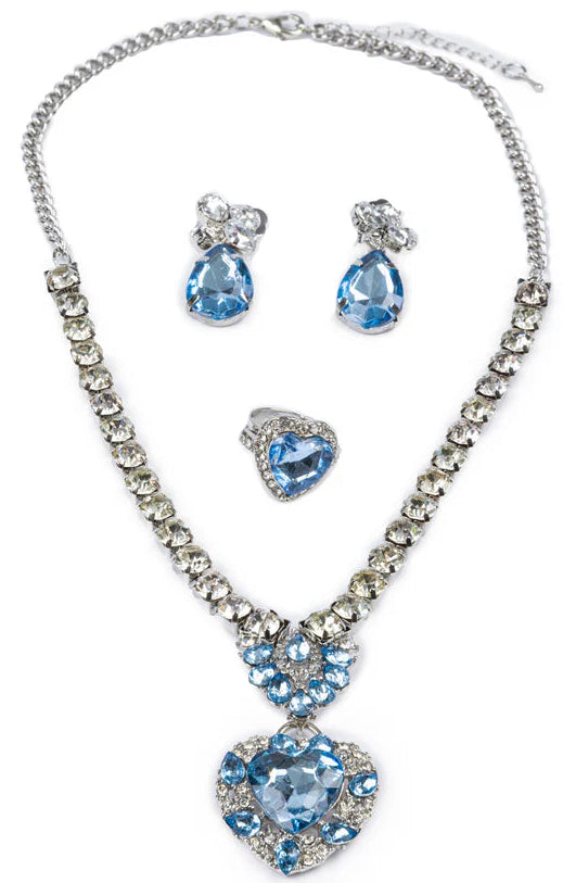 Classic glamour gets a modern twist with The Marilyn 4 Piece set. This bold and beautiful boxed-set includes blue & silver clip-on earrings, a heart-shaped ring, and a coordinating necklace jam-packed with jewels.